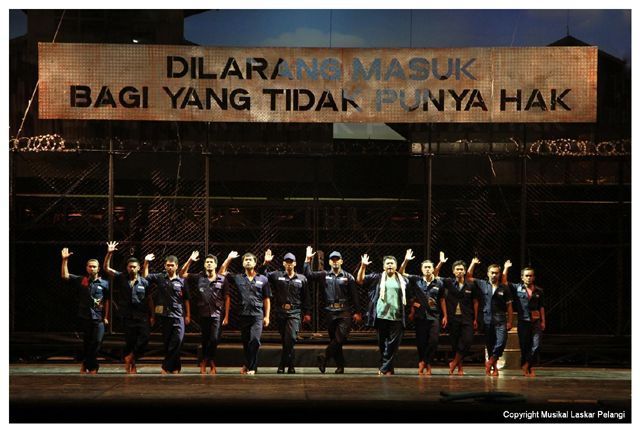 Kemudian mata saya juga menangkap layar panggung yang lebarnya sekitar 12 meter dan tingginya sekitar11 meter. Fungsinya, ternyata juga sebagai layar proyektor untuk judul dan daftar cast nya. Setelah terangkat, mulai lah set pertama, pabrik PN Timah. Kejutan pertama pun dimulai, saat tiba2 ada colt hitam jalan dengan damainya di tengah panggung. Ah gila. Kemudian turunlah si ikal dewasa yang kembali ke Belitong. Dia bercerita soal kampungnya yang indah itu. Disusul tarian para karyawan pabrik yang penuh semangat.