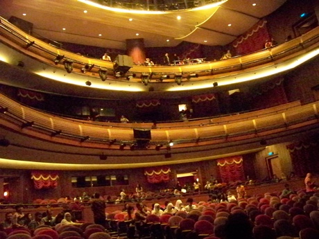 Eeeniweiii…Cukup jelasnya pemandangan pentas musikal itu bikin saya bisa melihat detail keseluruhan. Awal duduk, saya celingak celinguk norak karena baru pertama kalinya masuk dan duduk di teater jakarta. Di mata amatir saya, rasanya tata letaknya mewah ya. Warna merah di tirai-tirainya, plus tekstur kayu dan kursi yang berlainan warna, tapi tetap didominasi warna merah-ungu yang middle tone, karpet abu-abu, balkon dua tingkat, dan lengkapnya sarana pencahayaan dari langit-langit tertinggi sampai terendah, yang menjadikan tayangan paripurna.