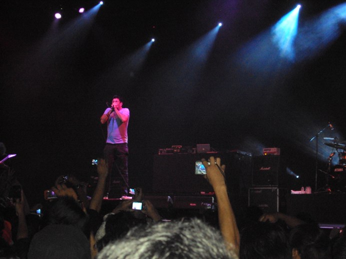 Bedanya ada lagi, Chino teramat ramah. Dia menyapa, menegur dan bahkan mengangkat tinggi2 kaleng bir warna merah punya kita “This is delicious, bintEng!!” hahaha,,,,truly hiburan dari bapak2 yang umurnya udah 40-an itu. Udah gak muda memang, tapi masih gila-lah. Selesai 22 lagu dihentakkan, mereka masuk. Tapi suara “We want more” dari penonton yang meminta encore gak terlalu banyak, dan antusiasi. Seolah yakin seyakin-yakinnya bahwa band asal Sacramento, California ini pasti ngasih encore. Dan iya, ada encore, sudah ketebak, Roots dan 7 words. Lagu kebangsaan. Yang dibawakan dengan memanjat pagar pembatas. Chino berteriak, melompat dan menggila persis di hadapan penonton yang ada di lini terdepan. (sudah pasti gak ada saya.. takut bengek! Hahaha J) semua berdesakkan, moshing dan ikut serta larut dengan energi yang ditularkan, terutama oleh Chino dan si bassist Sergio Vega. Ledakan energi itu, gak Cuma terasa di baris depan, tapi juga di baris saya, samping panggung. Semua yang tadinya hanya melompat kecil, menganggukkan kepala, menghentakkan kaki sambil ikut nyanyi, di sirep 7 words dan langsung melenting.