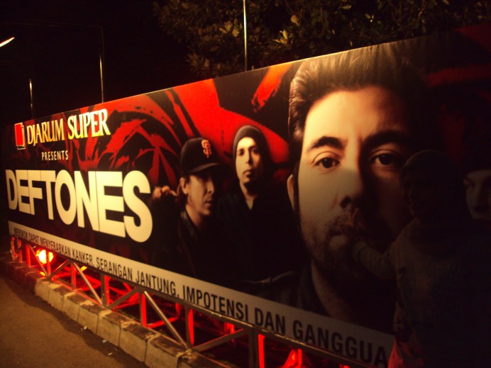 Masih punya sekitar 10 menitan, kita celingak celinguk. Yang dateng, kebanyakan emang seumuran saya, malahan banyak ketemu temen SMP-SMA dan kuliah disana. Berasa reunian. Tapi gak sedikit juga orang yang lebih tua, bahkan ada juga bocah kuliahan yang membaur di ribuan manusia. Meskipun, semua penonton rasanya punya pikiran yang sama dengan saya, gak sabar liat deftones. Panggung yang kosong, tanpa embel2 tulisan DEFTONES di backdrop nya, atau kincir raksasa macam di konsernya smashing pumpkins, membuat poento, si analis dana bilang “Gila juga ni Java, kosong melompong gini, sponsor Djarum, untungnya pasti gede,” hehehehe…