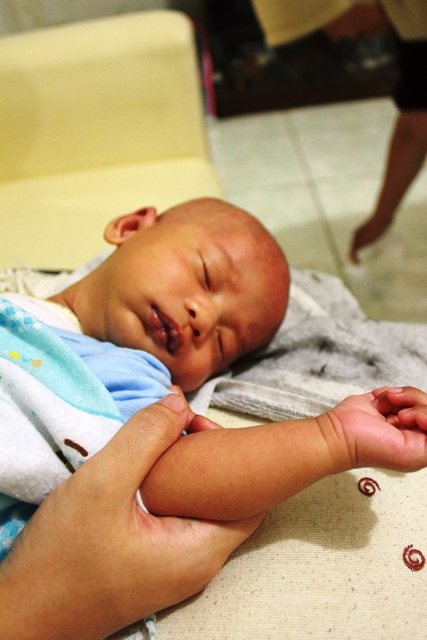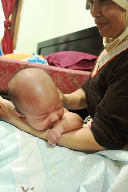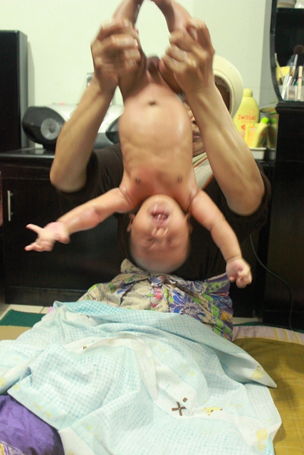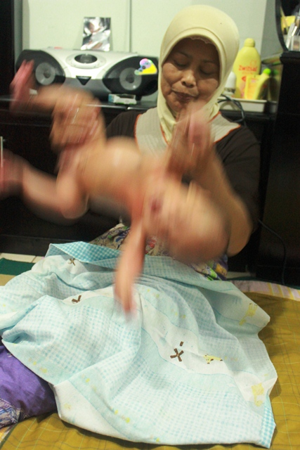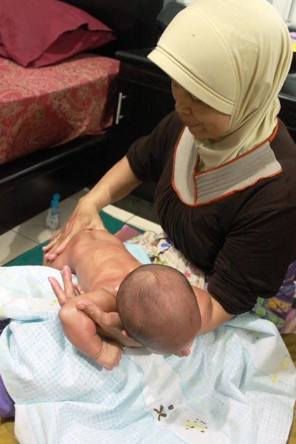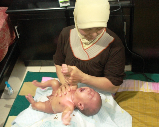 Diawali dari Abib. Anak ganteng saya ini ditelanjangin, trus dioleisin baby oil ke seluruh badannya, kemudian mulai dipijet. Saya gatau ya yang dipijet otot mana, syaraf mana, tapi si Abib badannya langsung merah semua. Hahaha…masuk angin bang? Doi udah nangis2 kejer, sampe kasian saya dengernya. Tapi sji Bu Pono dalam damai malah terus2an ngomong “Iya hayo nangis kenceng, hayo..” he? Hehehe..