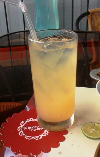 Sementara si pantera rosa ini adalah perpaduan jambu, nanas, jeruk dan sirop grenadine. Jadi rasanya asem2 manis gurih, nikmat banget seger. Cuma kalo frappe alla banana nya saya gak nyobain, karena enggak doyan pisang. Tapi kata Poento, rasa pisang, eskrim vanilla dan susu nya seger banget. Hehehe….