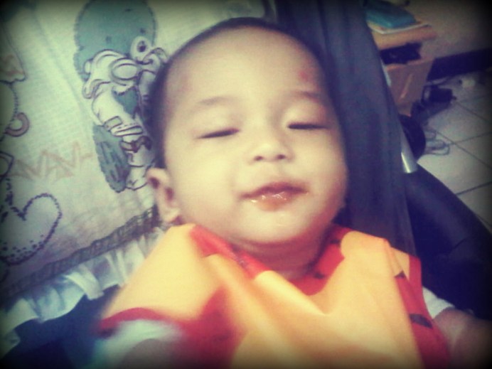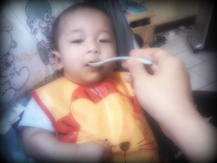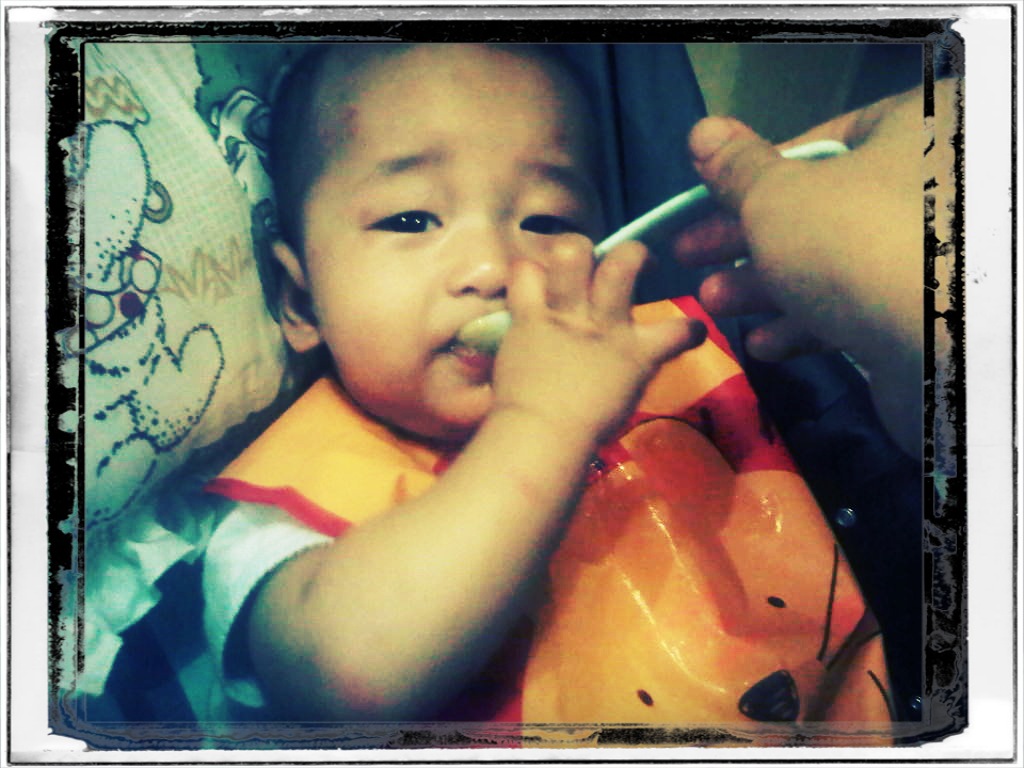 20 menit, setelan siap mewek dan tutup mulut. Hahaha…yang ini saya gak bisa motret, karena ribet. Yaudah saya berhentiin makan, angkat dari kursi, dan gendong2. Gak lama, dia minta netek, dan mukanya BAHAGIA banget saat saya susuin.
