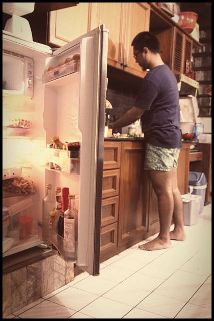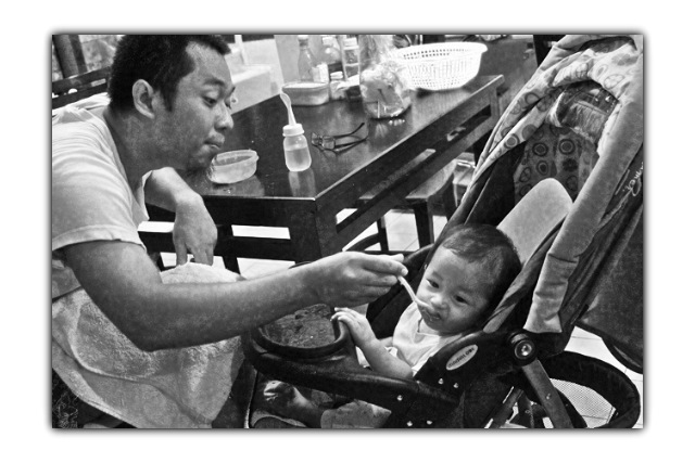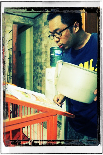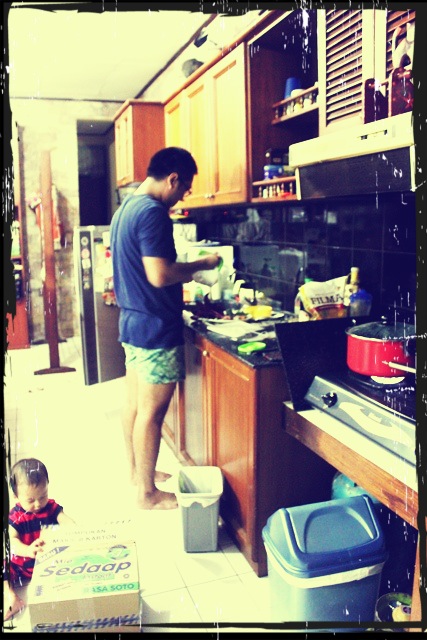 Dan inilah tampilan si Daddy yang asyik masak. Ohiya, btw, dia baru tau bahwa masak tim itu adalah PE-ER, saat bahan utamanya:BERAS. hahahaha..kudu direndem dulum trus saat direbus bareng lauk, harus diaduk-aduk sampe bloon, baru deh mateng. “Emang masak bubur seribet ini ya? Emang airnya harus banyak gitu? Kalo gak diaduk gak mateng?” pertanyaan yang bikin enyak berhenti motret dan bergegas ambil sendok kemudian bilang: “Udah sana masak yang lain ajah, ini biar aku yang adukin..”