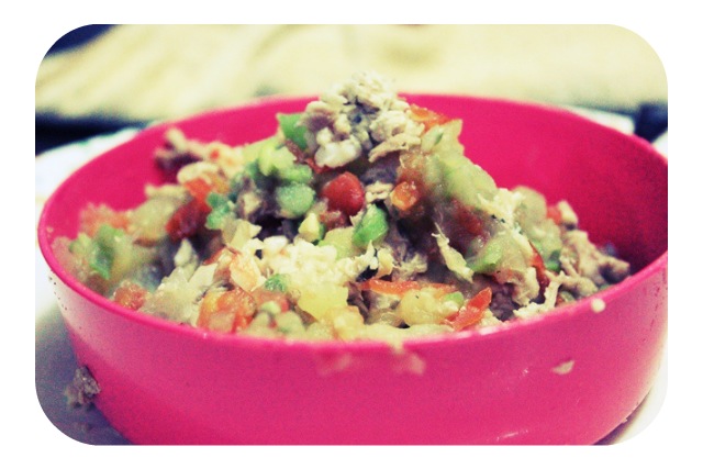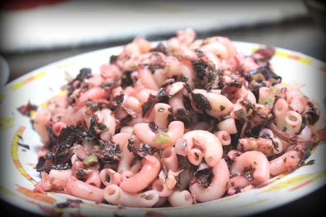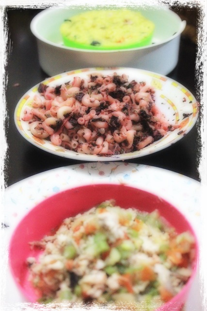 Salad Pasta! Itu merah-merah karena pake bayam merah. Ini tampilan sebelum rusak dibejek-bejek, karena kamu masih agak susah ngunyah makaroni. Maklum, gigi belom nongol2. Hihihi