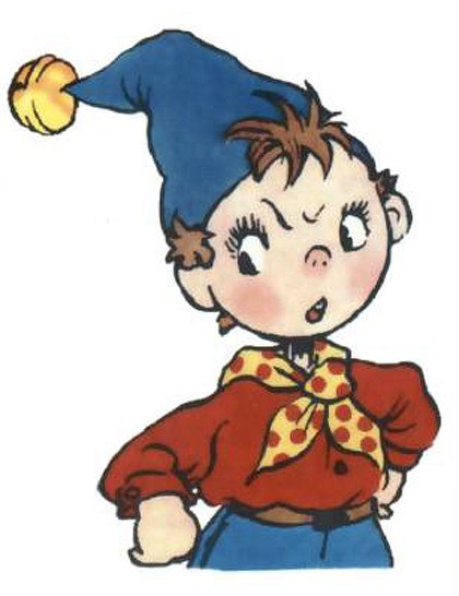 Noddy, bocah yang tinggal di toyland, dan kerjanya ‘narik’ taksi-nya sendiri. Dia selalu pake topi muncung itu, dan kalo dia lewat, klaksonnya pasti berbunyi ramai. Lebih lengkapnya, bisa browsing sendiri ya? Hehe..