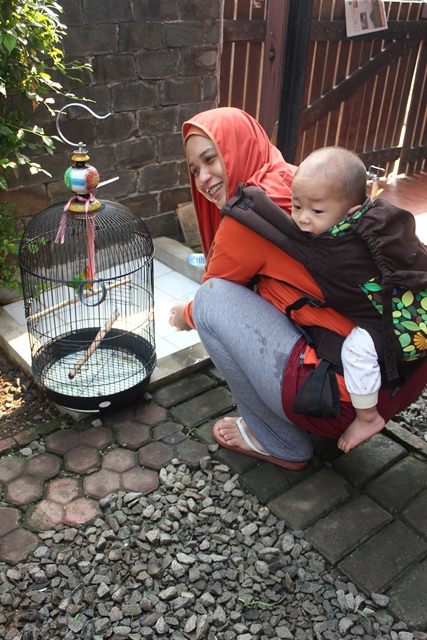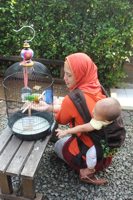 Saya bahkan bisa bersihin kandang dan ngasih makan fiona, sambil jongkok, sambil gendong Abib.