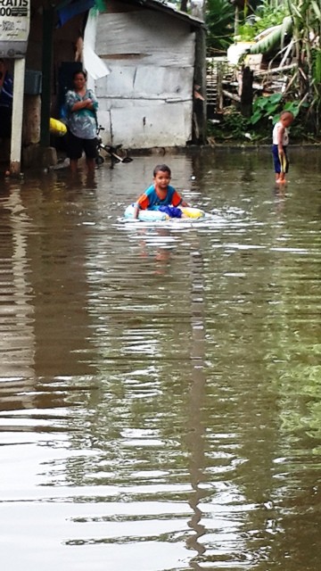 Di jalanan depan dan belakang komplek, airnya sudah sepinggang saya. Fyi tinggi badan saya Cuma 158 cm sih….hehe..