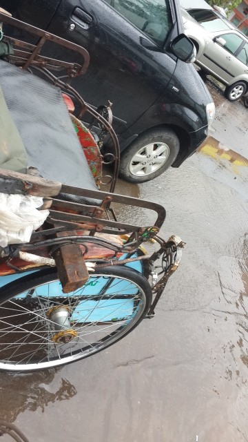 Dari depan komplek ke rumah, kami naik becak, yang kursinya ditinggikan. Naik becak rasa perahu.