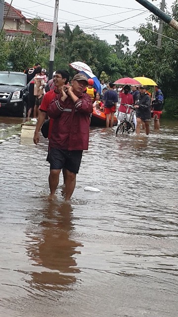 Yaudah, jam 8 malam, kami pergi makan keluar. Sekalian Poe ada urusan kerjaan. Sepanjang jalan berangkat sih kita santai banget. Tiba-tiba, jam 10.30 malam, saat menempuh perjalanan pulang kerumah, tetangga sebelah dan si bibi yang dirumah pada heboh ngabarin bahwa air udah mulai naik.