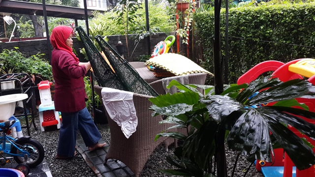 Panggil Mpok, bareng bibi, berempat kami sikat rumah. Sebab kan banjirnya juga tak seberapa tinggi, jadi dampaknya enggak parah. Tapi kami tetap mempersiapkan hal buruk yang mungkin terjadi. Jadi siang sekitar jam 1, citra datang dan evakuasi kucing dan burung ke rumahnya yang aman dari banjir.