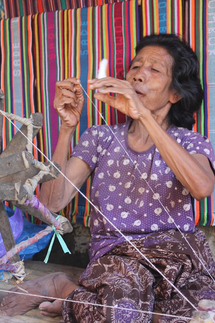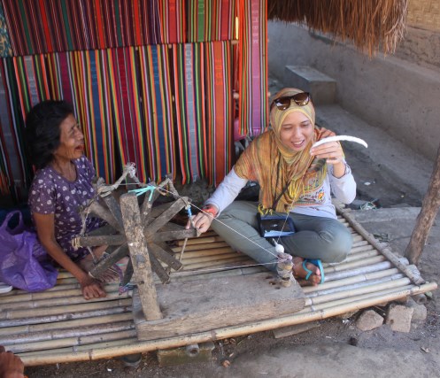 Tapi kocak juga. jadi, guide lokalnya cerita bahwa syarat gadis Lombok sudah boleh menikah adalah dia sudah bisa memintal kapas menjadi benang dan menenun benang menjadi kain. Nah, saat berkeliling, saya melihat nenek-nenek yang asyik memintal kapas. Saya minta nyoba, penasaran dong yes. Saat nyobain, sampe keringet segede jagung, tu kapas putus terus gak jadi-jadi benang. Hahahaha…ampun baang…