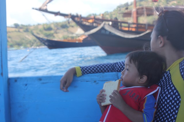 Jadi si Abib Cuma nyemplung sebentar, kemudian minta naik karena dua alasan: satu, ombaknya kenceng, dan dia yang kecil itu kelelep melulu. Dua, dia LAPER. Untung bawa bekel roti, jadi sambil jalan menuju gili trawangan, dia bisa nyemil. Ishh..ni anak kecil kelakuannya deh.