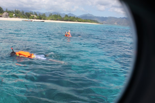 Setelah kenyang, kita nemenin Abib main-main pasir sebentar, nyemplung-nyemplung sebentar. Tapi karena rame banget, jadi agak males lama-lama di pinggir pantai. Jadi lanjut lagi snorkelingnya. Seperti pantai-pantai yang lain di Lombok, disini juga sama. Enggak jauh dari bibir pantai udah langsung dalem. Ya engggak dalem banget sih, 170-180 cm-an.