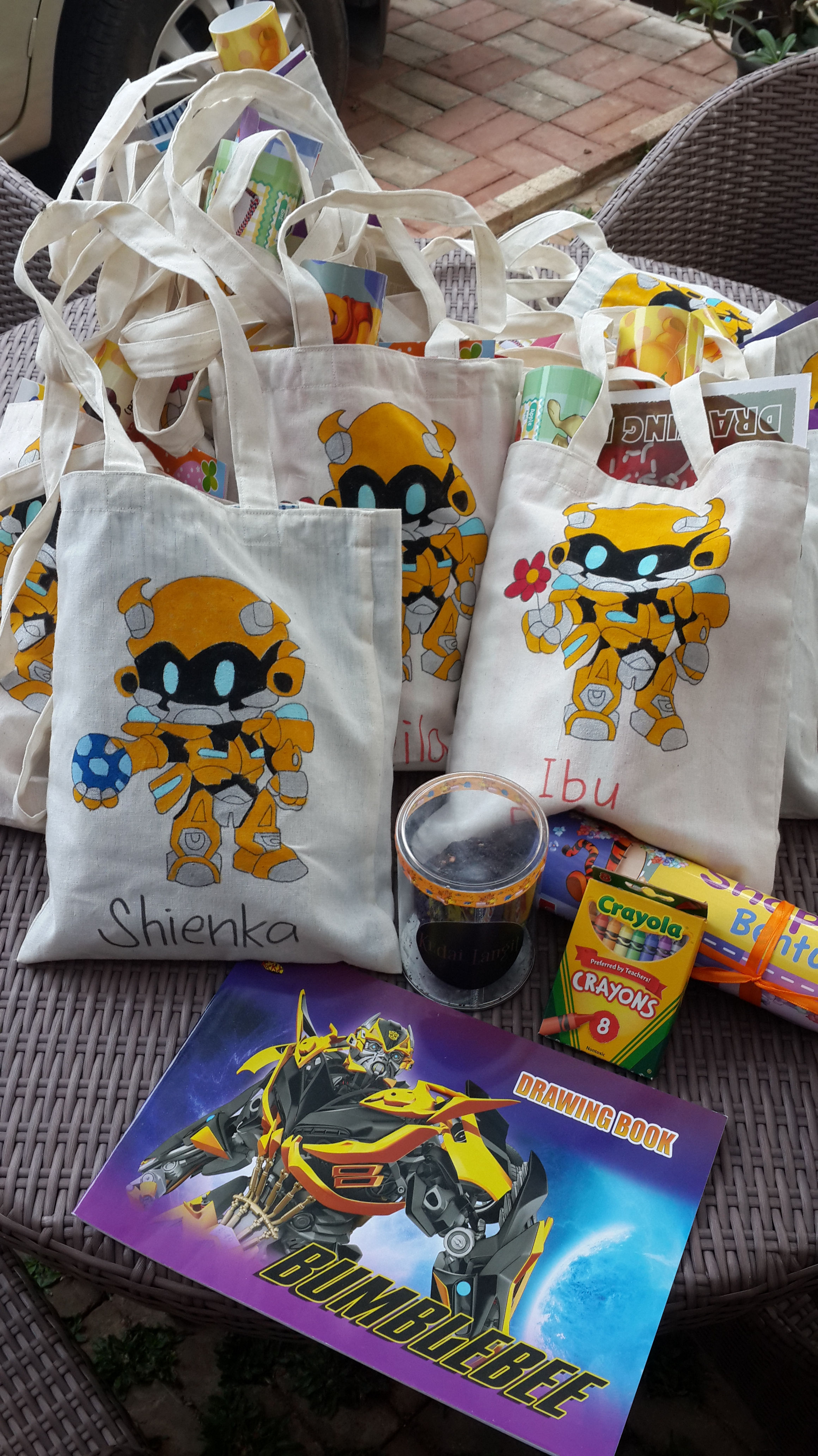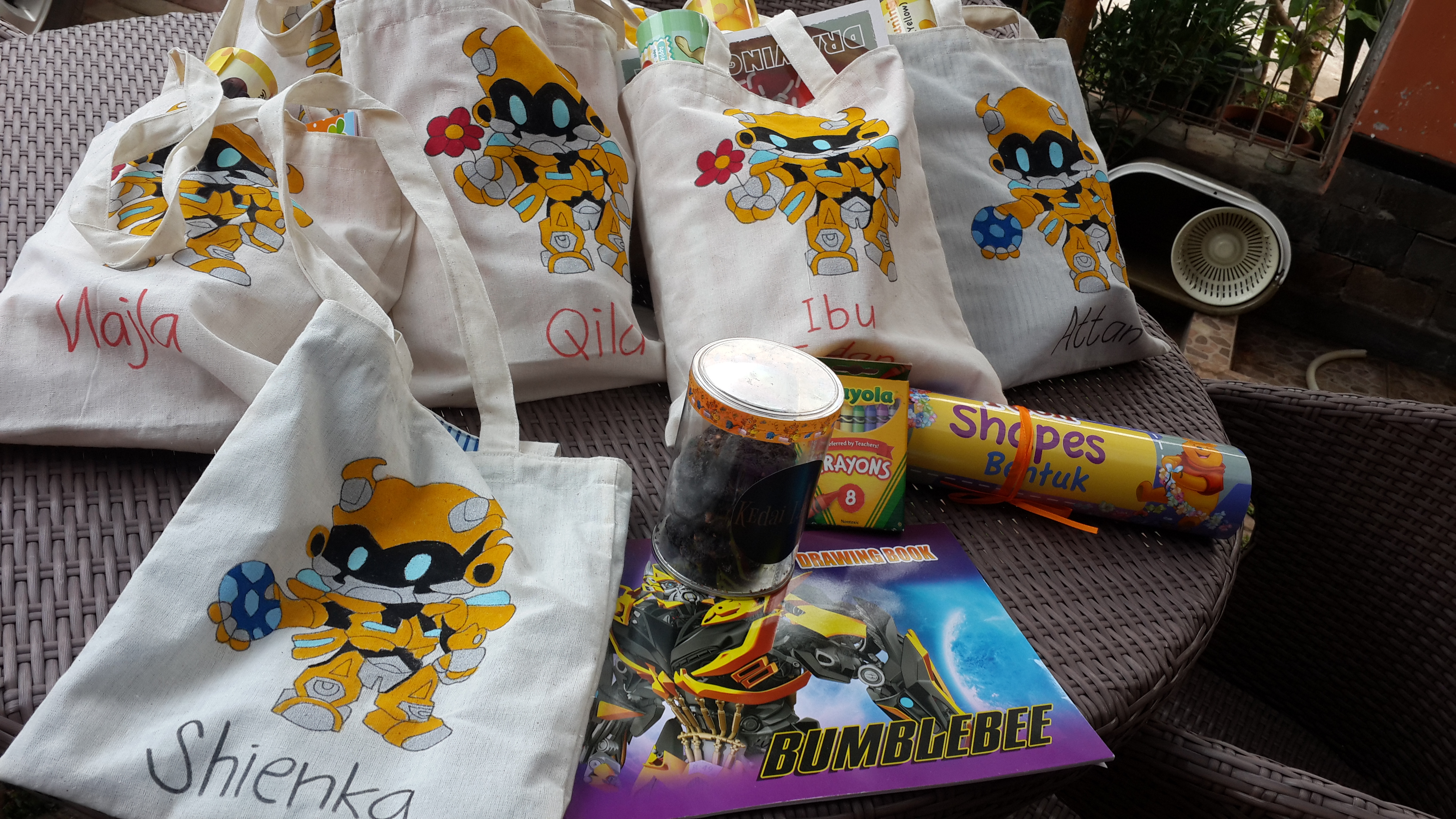 Abib mau tasnya gambar BUMBLEBEE. Akhirnya saya gugling nyari gambar bumblebee yang lucu dan cocok buat anak-anak. Secara kan tu robot tampangnya sebenernya serem ya. Hahahaha