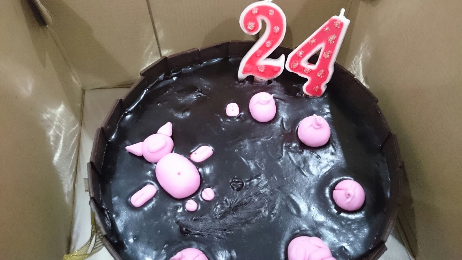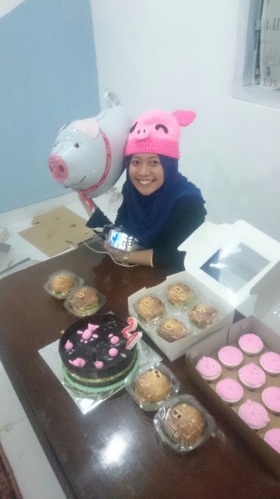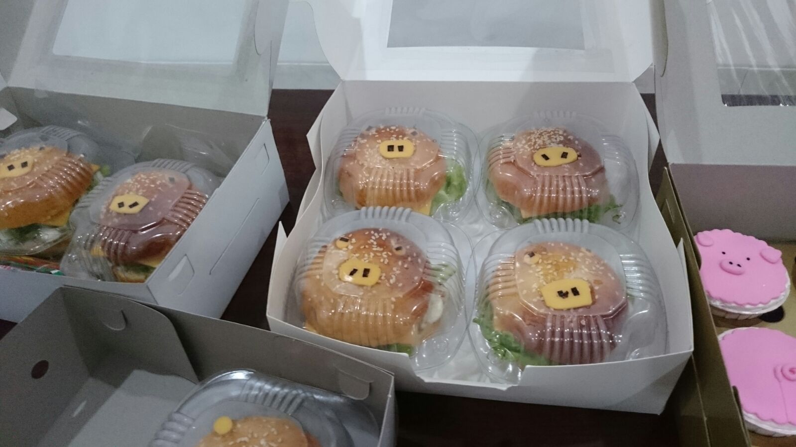 Saya pesan cupcake bentuk muka babi, cake coklat dengan babi2 kecil sedang berkubang, juga burger dengan muka babi. Saya sih tetap meminimalisir keberadaan fondant. Karena suka ngeri ngebayangin begitu berbahayanya kadar gula dan pewarna makanan di balik kecantikan kue itu. hahahaha…