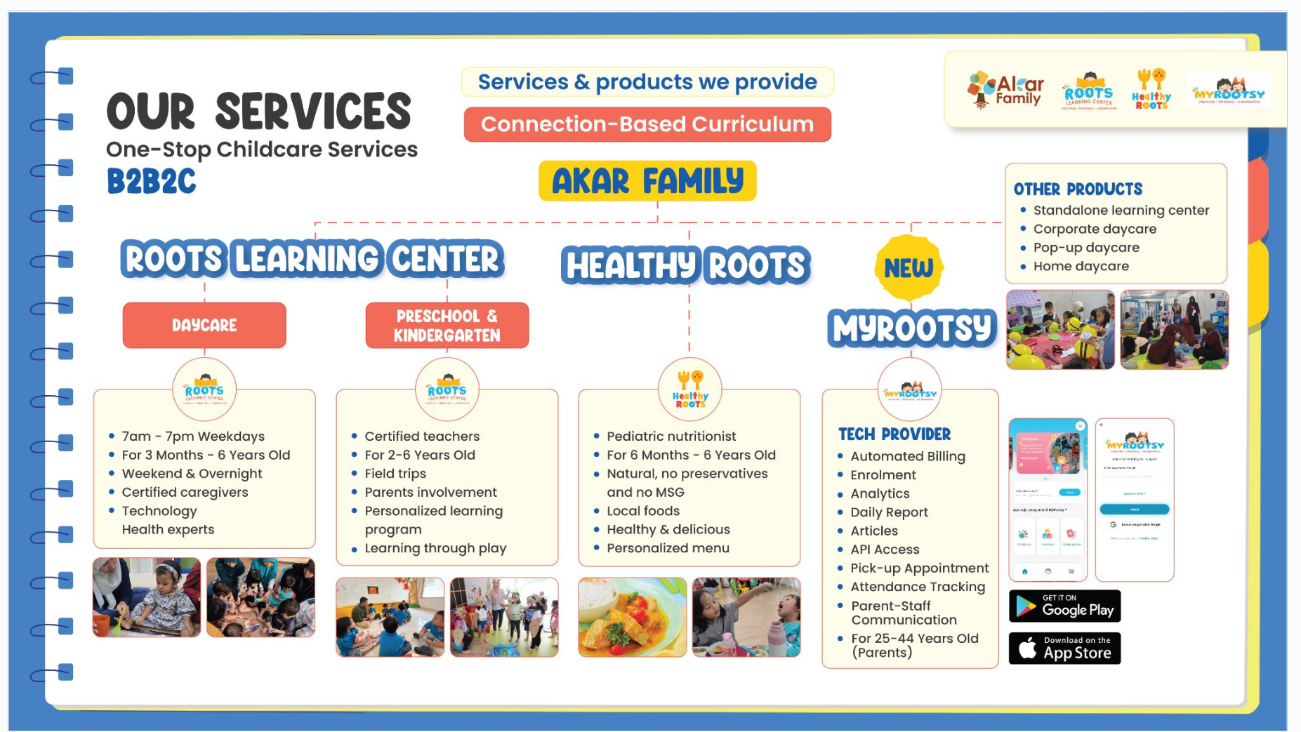 Educator and parent training, quality standards, curriculum, policies, SOPs, and operational tools—so that every early learning center in Indonesia can use it to grow, sustainably and with heart.
