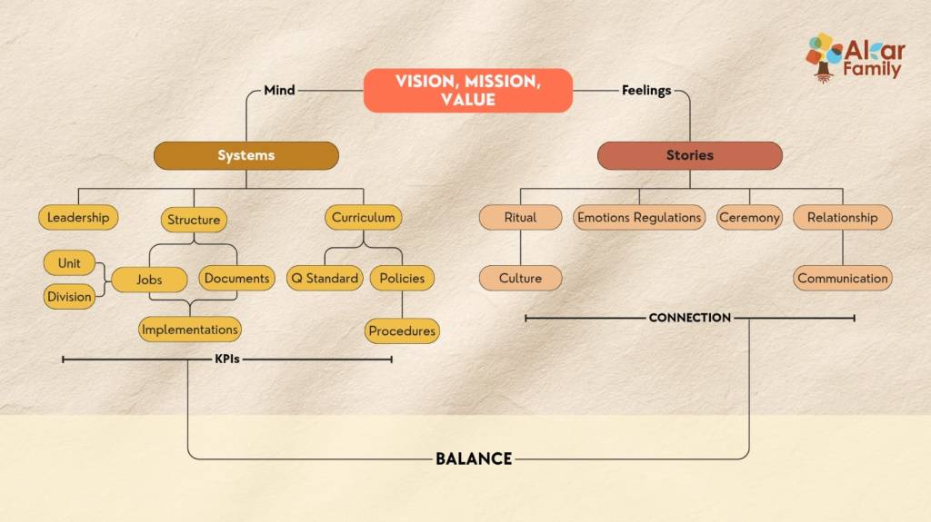 Semua harus dilandasi kerangka kurikulum lima akar pertumbuhan kami yang sebetulnya awalnya memang dibuat hanya untuk anak usia dini sejak usia 3 bulan sampai 6-7 tahun. Namun, ketika harus membuat sistem “penilaian” kompetensi dan kinerja karyawan, kami menggunakan landasan lima akar pertumbuhan juga sebagai dasar utama.